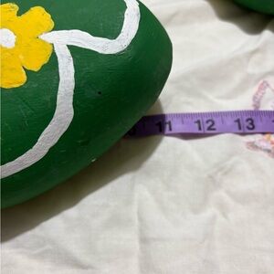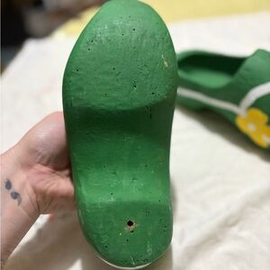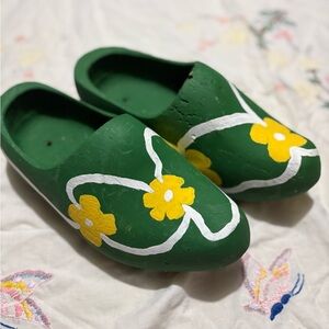 Vibrant green clogs with yellow floral design and white accents. Perfect for a unique style statement.