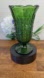 A striking vintage pedestal vase in rich emerald green glass, featuring an embossed repeating leaf motif and a scalloped rim. The pedestal base and textured design give it both height and elegance, making it perfect for floral arrangements or as a bold decorative accent. A classic example of mid-century pressed glass artistry, this vase adds a pop of colour and style to any space.