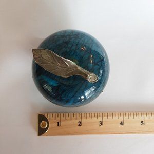 Beautifulb blues and teal marble lines throughout the green apple which gives it its richness. The matted gold color of the brass leaf and stem adds to the charm of this wonderful Marble apple.