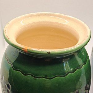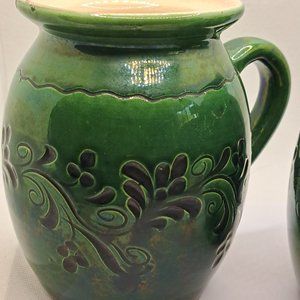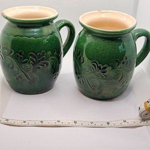 Two Vintage Green Pottery Mugs. wonderful pattern on sides. One of the mugs has a couple of flea bites on top...see photos. Thank you for visiting.