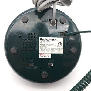 This is a green telephone made in the 1980s for Radio Shack, the later Nortel. It has the look of an older style of phone but is push button rather than rotary. It has been tested for incoming and outgoing calls, has a working ringer and I replaced the phone line. The line of the handset sticks out somewhat (there is a picture). You may have noticed sticker glue on the handset but I cleaned that up after taking the pictures. If you have a VOIP line you will need an adapter.