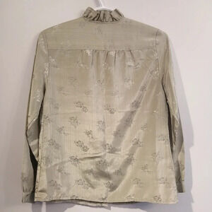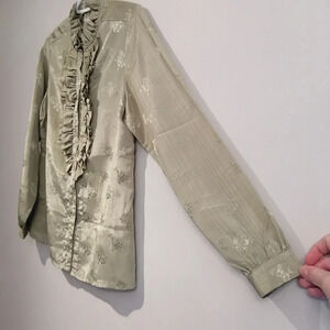 Vintage Green Satin Floral Embroidered Button Up Blouse with Ruffle Bib Small