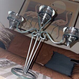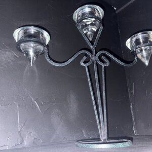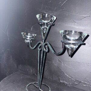 Vintage Green Speckle Metal Tea Light Candelabra with Glass Cones