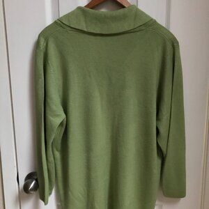 Vintage green sweater with large collar and cable knit pattern on the front of the sweater.