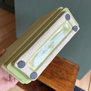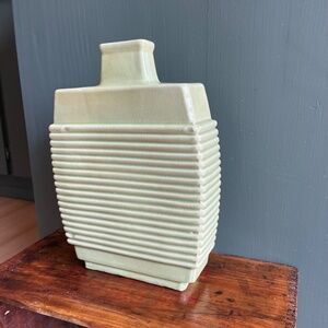 Vintage green textured oversized ceramic vase. Great statement piece - no stamps or signatures indicating maker. Finish has some crazing, see photos for details. Measures approx. 12.5" tall, 9" wide, 2.75" deep.
