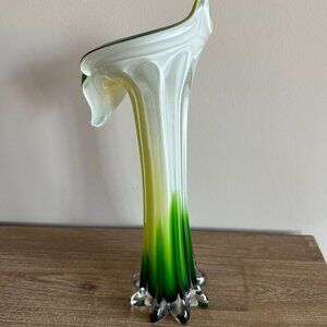 Vintage Green Yellow Hand Blown Art Glass Jack in the Pulpit Vase 12”