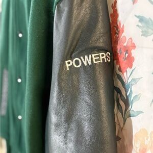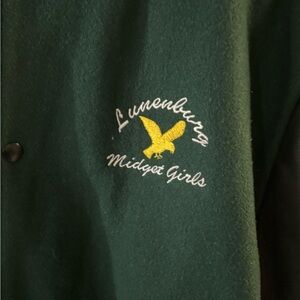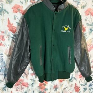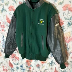 This bomber jacket combines a deep forest green body with contrasting black sleeves, offering a modern twist on a classic design. The addition of a hood enhances its sporty appeal, making it a versatile choice for casual outings. An embroidered emblem on the chest adds a touch of unique style.