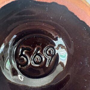 Its numbered base (569) and hand-applied glaze suggest mid-century or studio pottery origin. The glaze variation gives it that unique one-of-a-kind appeal collectors love.
