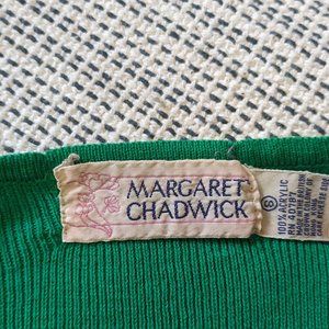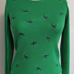 Features: green allover rib knit sweater with embroidered navy blue whales shooting water out of their spout; crew neck, long sleeve, made to be worn with negative ease (meaning the sweater measures smaller than when it's on)