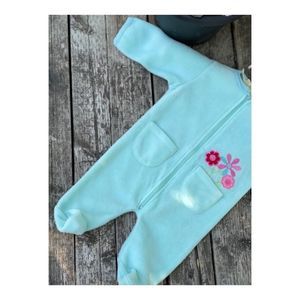 Size 6-9 months. 100% polyester. Full zip closure. Feet attached. Two front pockets. Floral embroidery. No holes, tears or stains. Pet and smoke free home