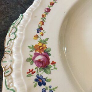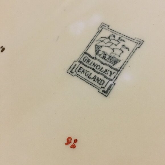 Good preowned vintage condition, white, ovate platter tray with fluted edges and gold painted accented trim by Grindley England. Unsure of the date and series, but it matches the Marlow series very well. Unique fluted edge and perfect handles for carrying. Bright floral motif featured at its center.