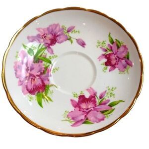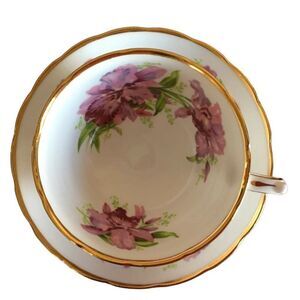 This Set has a beautifully shaped wide-mouth footed teacup. Both pieces are decorated by large purple-pink orchid flowers with green foliage, and both are trimmed in gold.