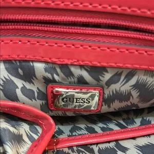 This Guess satchel showcases a brown monogram pattern complemented by vibrant coral accents. Funky Y2K lining.