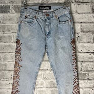 Vintage Guess Y2K Light Wash Metallic Gold Tiger Stripes Straight Leg Jeans