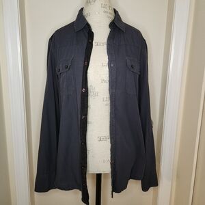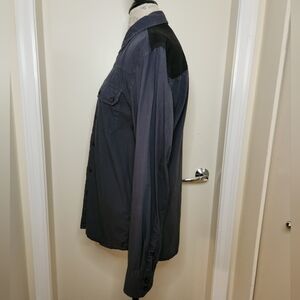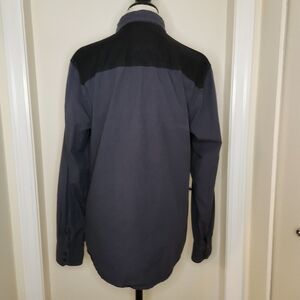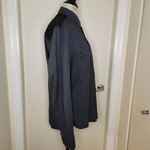 Black & charcoal blue colourblock cotton buttonup casual dress shirt with double buttoned front pockets, by Guess.
