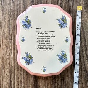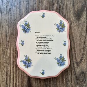 A decorative ceramic plaque adorned with blue forget-me-not flowers and a heartfelt poem welcoming guests, perfect for a rental or a spare bedroom. This cutesy item can be placed on shelves, tables, or hung on walls to add aesthetic appeal to a room.