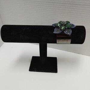 Vintage Gun Metal Green Blue Rhinestone Flower Cuff Bracelet Boho Retro Jewelry