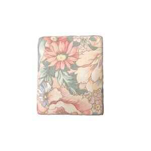 The exterior features a floral satin-style fabric in pink, green, and peach.