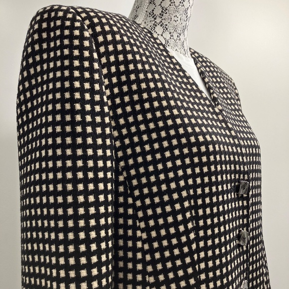 Black and white check fabric. The fabric tag is missing, but appears to be wool suiting.