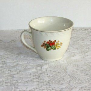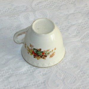 Single antique teacup only, no saucer. Ivory decorated with green, brown and yellow leaves, red berries. This pattern appears to be quite hard to find.