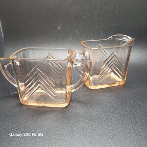 Vintage HAZEL ATLAS PINK CHEVRON CREAM SUGAR SET DEPRESSION GLASS ART DECO