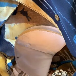 In shades of blue, brown, white, and yellow, this blouse exudes timeless charm. Its shoulder pads, in excellent condition, add a touch of structure to your look.