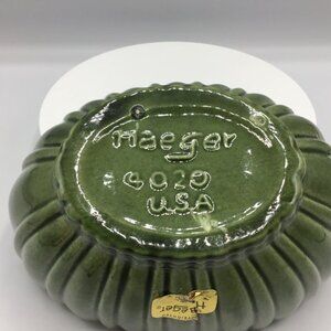 This is a Haeger Footed Green Ribbed Bowl. It is Mid Century Modern. It is 9.5” X 6”. It is signed. Original sticker is ripped. There are two small chips as shown in photo.