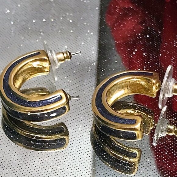 Vintage estate 1960-1990's enamel half moon earrings with navy blue sparkly enamel and gold plated outline creating a unique, shiny elegant effect. About 6mm width and approx. 22mm height. These are in excellent condition with no repairs, cracks or damage or repairs of any kind. Minor wear and tear- not visible.