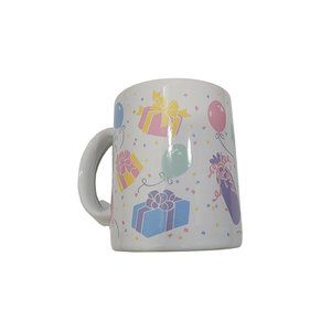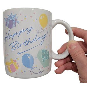 This is a vintage Hallmark "Happy Birthday" Coffee Mug / Cup (from the year 1986, as shown on the bottom, which is pictured). It holds 12 fluid ounces (12 oz). It is full of pastel colours with presents, balloons, and confetti all around the mug. It basically looks brand new, still has its original shine, without any stains, nor any cracks or damage. It measures approximately 4 inches high. It's perfect for the vintage collector or coffee mug/cup collector and has a cheerful look with its pastel colours throughout.