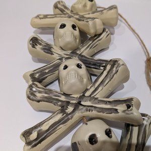 Vintage blow molds of small skull & crossbones - 6 in total on twine for hanging indoors or outdoors, great for Halloween! In overall good condition with minor wear consistent with age. Skulls combined measure 16 inches, can adjust length with twine.