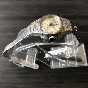 The case measures 22mm without the crown and features an oval shaped silver dial and silver stick markers