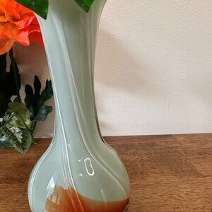 This striking vintage hand blown glass vase is a true conversation piece, featuring a vivid emerald green ruffled top, pale celadon body, and a rich orange swirl at the base. Its organic form and bold colour blocking make it a standout in any space, perfect for lovers of mid-century modern or contemporary art glass.