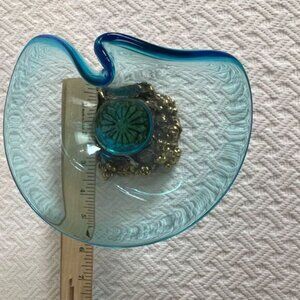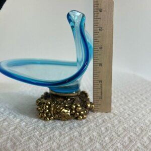 Vintage Hand Blown Blue Glass Bowl Tray Plate Centerpiece Metal Gold Base MCM