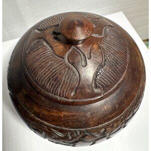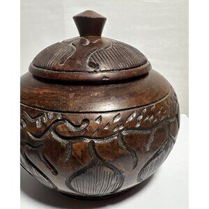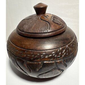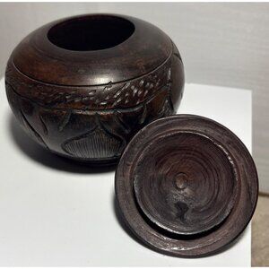 Vintage Hand Carved African Wooden Spice Jar Round With Lid 4.25" Tall