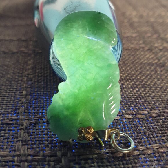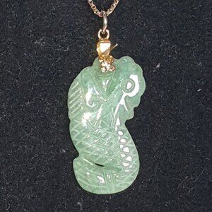 Rare vintage genuine green jade pendant, hand-carved into the legendary dragon-koi, symbolizing courage, determination, and transformation. In Chinese lore, the koi that leaps the Dragon Gate becomes a dragon – a timeless emblem of ambition and success.