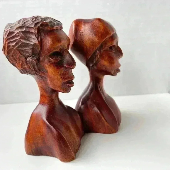Vintage Hand Carved Wood Sculptures Man & Women Couple Bust African folk art