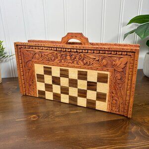Vintage Hand Carved Wooden Chess Board Folding Ornate Inlaid Wood Travel Game