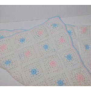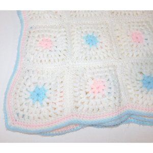 Vintage Hand Crochet White Pastel Pink Blue Knit Baby Infant Crib Blanket