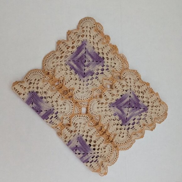 This lovely small table runner/doily/dresser scarf comes from an earlier era - most likely mid century. It is hand crocheted in colors of purple, orange, and beige cotton threads. Measurements are 9 inches wide x 30 inches long.