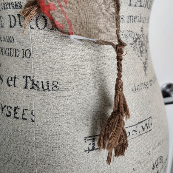 Vintage 90s, Soft Cotton Rayon Chiffon, Stripes, Chevron, Polkadots, Begar Rusty Red, Vintage Condition, one small run and at least one missing tassle, no tags, 36x40.