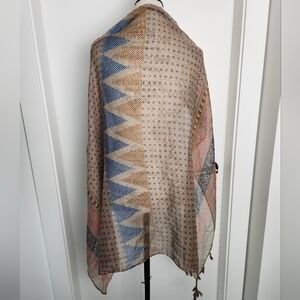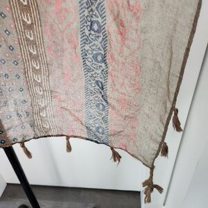 Lightweight Semi Sheer Tan Brown Natural Dye Patterned Shawl Wrap Dupatta Scarf with Fringe Tassle diagonal ends.