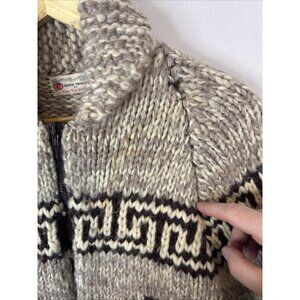 Beautiful vintage hand-knit wool cardigan by Tina Van Rooyen. Heavy chunky knit in classic Cowichan style with animal and geometric pattern. Thick shawl collar and full zip front. Handmade piece with great texture and character.