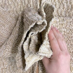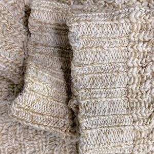 Good vintage condition. No holes, No pulls. Minor pilling in high friction areas. There are two dark spots on shoulder and chest areas and some discolouration on cuffs, shown in pics. Full front zip. Hand knit. Cannot confirm material content as there are no tags. Fits like L, measurements in pics.