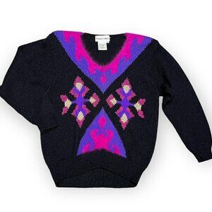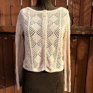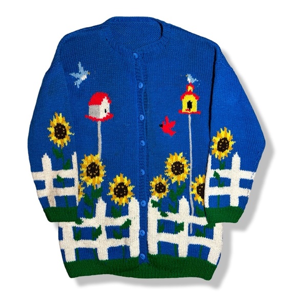 Vintage Hand Knit Sun Flowers & Bird Houses Button Up Sweater