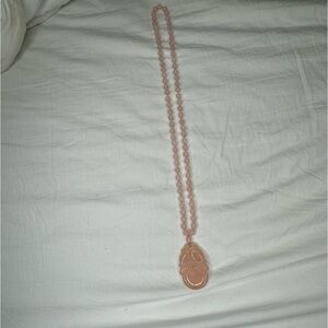 Vintage Hand Knotted Rose Quartz Necklace With Large Carved Peach Pendant