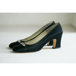 Vintage Hand Made Back Satin Rhinestone Slip on Heels 6.5.