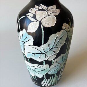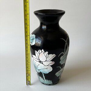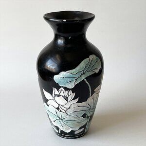 Vintage one of a kind vase featuring hand-painted floral and leaf on a glossy black background. The artwork has a soft, translucent, watercolor-style appearance, giving the piece an elegant and artistic look.