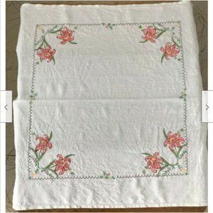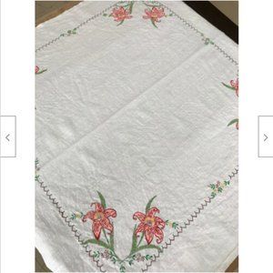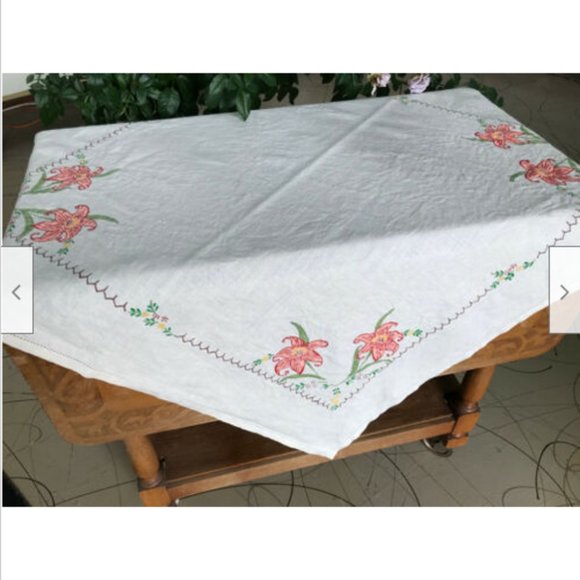 Vintage hand painted linen table cloth with a pretty tiger lily design. Beige linen, 33" x 35". Very good pre-owned condition, there are 2 small discolorations, see photos.