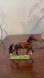 Vintage hand-painted metal toy horse figurine featuring a dark brown horse with a black mane and tail, and a reddish-brown saddle with a green saddle pad. The horse stands on a rectangular green base.