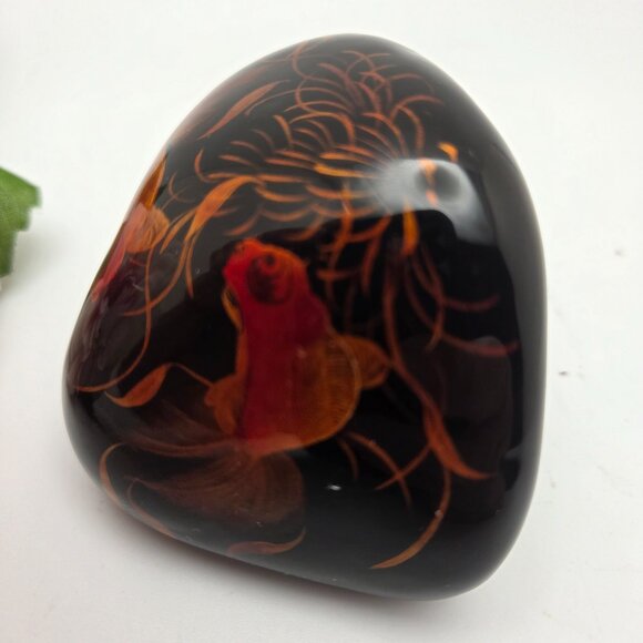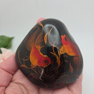 Vintage Hand Painted Paperweight Orange Koi on Black Laquered Stone Vietnam